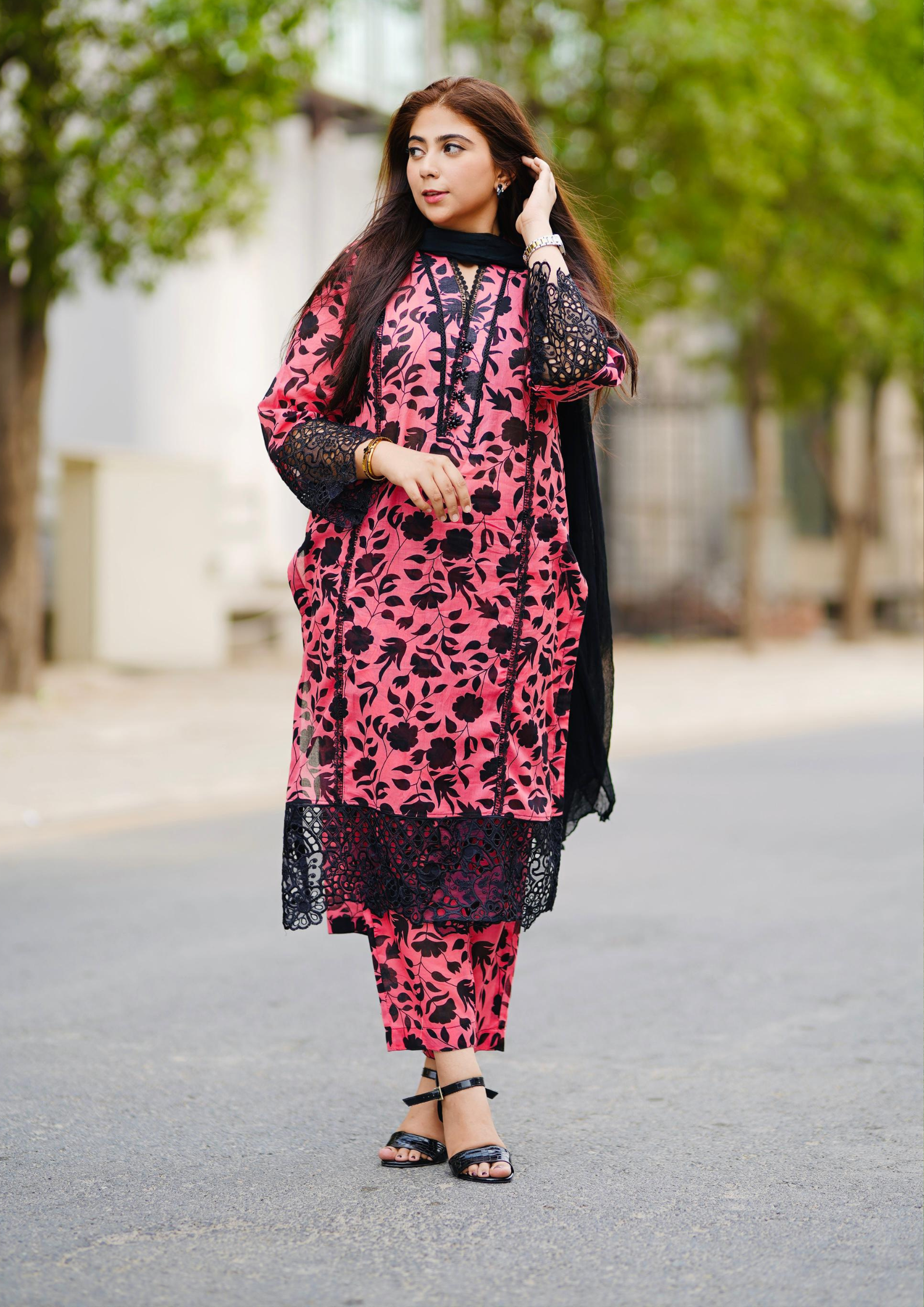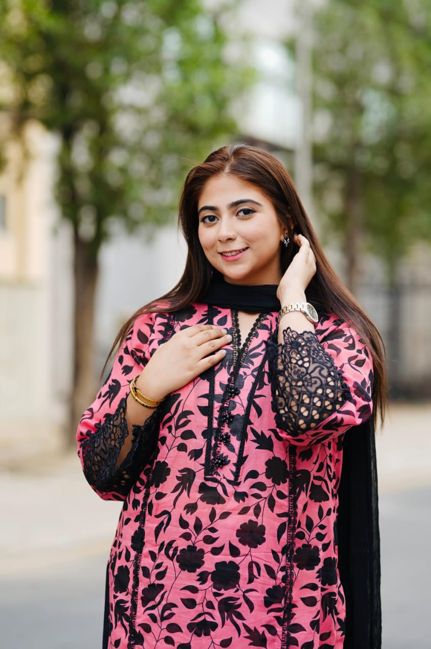 This stunning pink and black outfit features intricate floral patterns, elegant lace detailing, and a flattering silhouette that radiates confidence. Designed for festive gatherings, evening dinners, and special occasions, it combines traditional charm with a modern edge.
